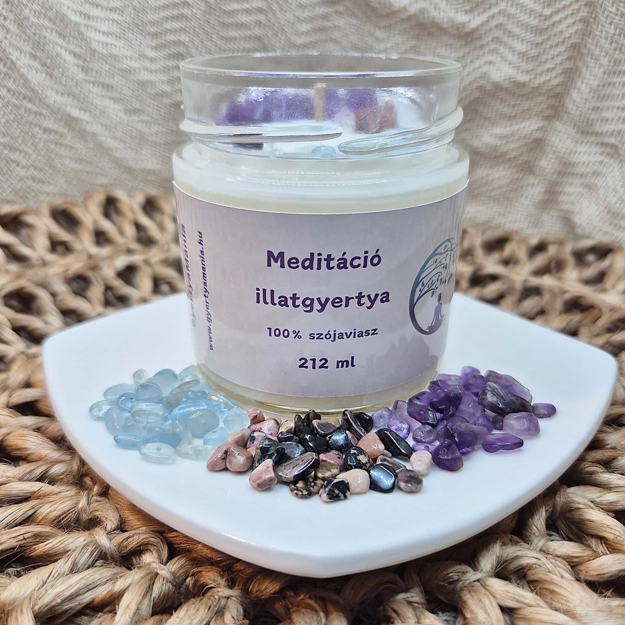 „Meditáció” ásványokkal díszített gyertya Rodonit, ametiszt és akvamarin ásványokkal díszített gyertya